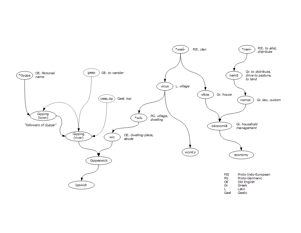E.g., geap, an Old English word meaning “to wander” 12; or from the Gaelic word caep, cip, congate with the Latin caput, or head, source. The Gipping being the head of the river Orwell 13.